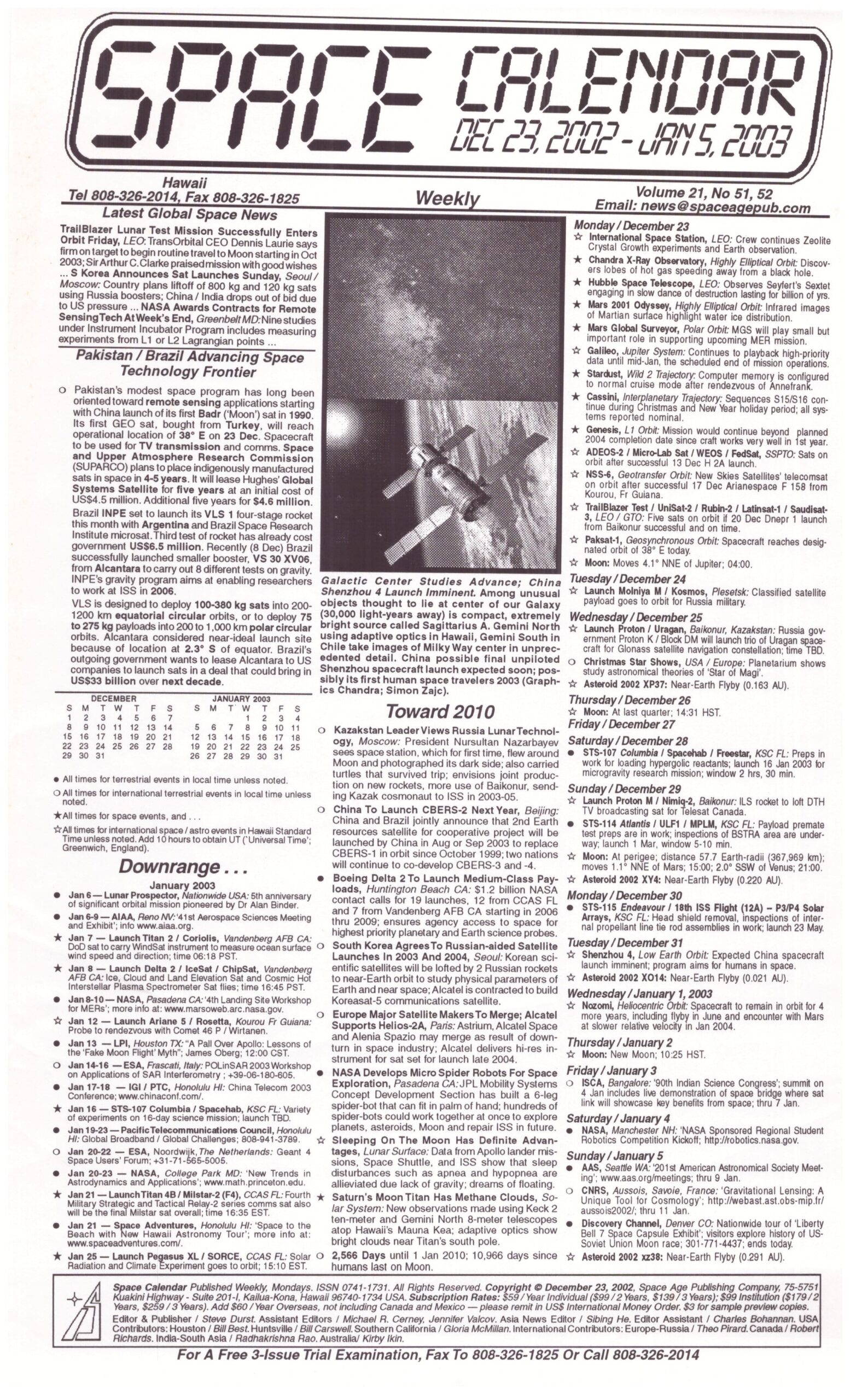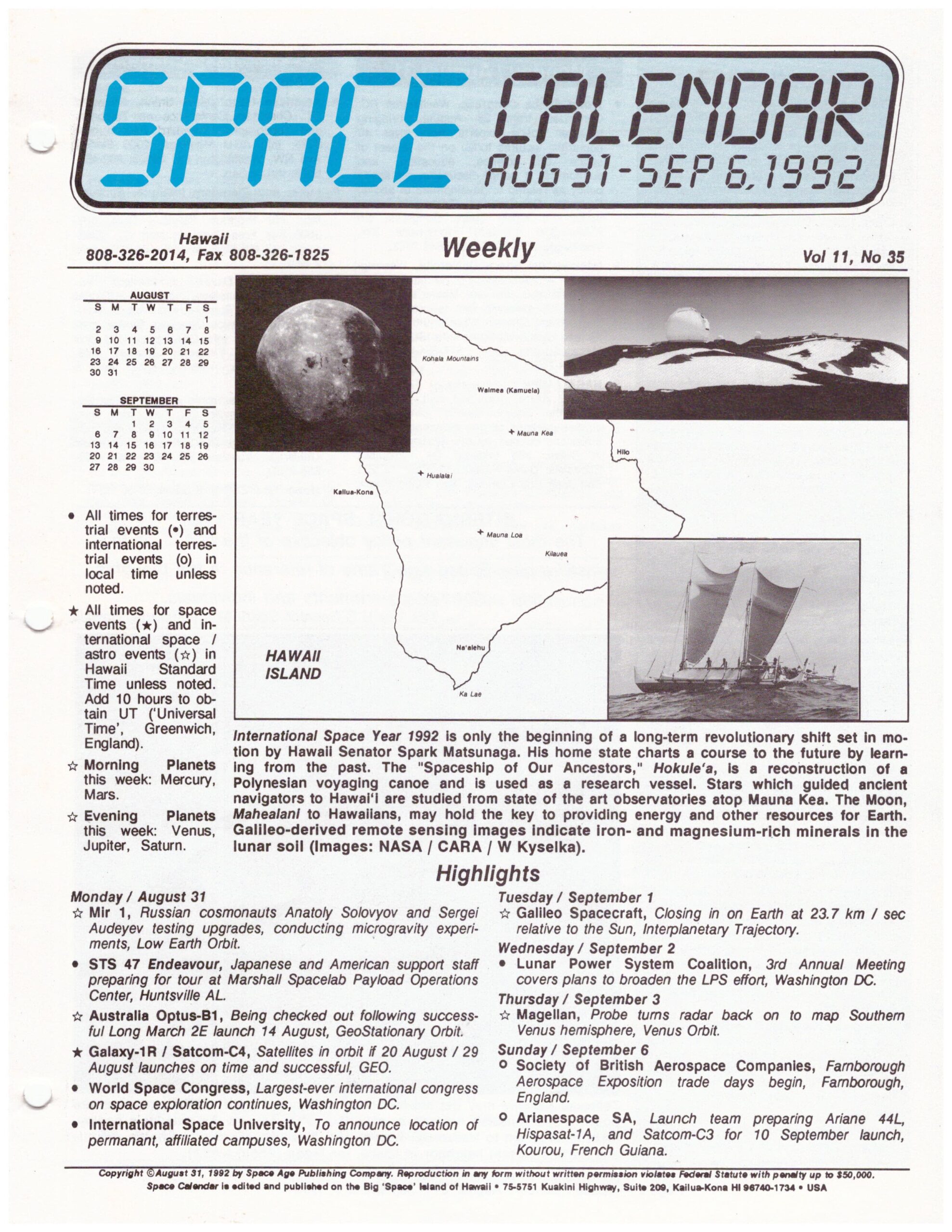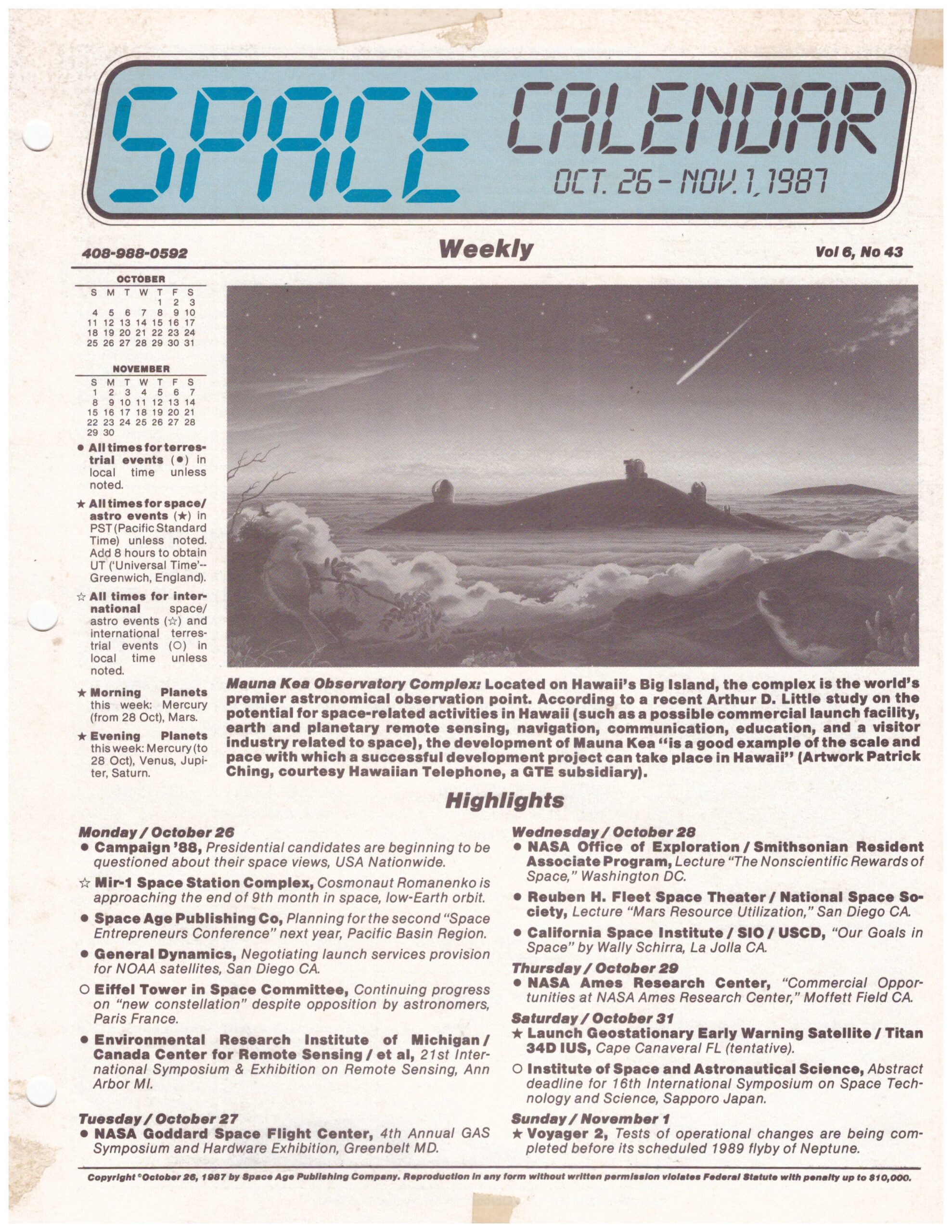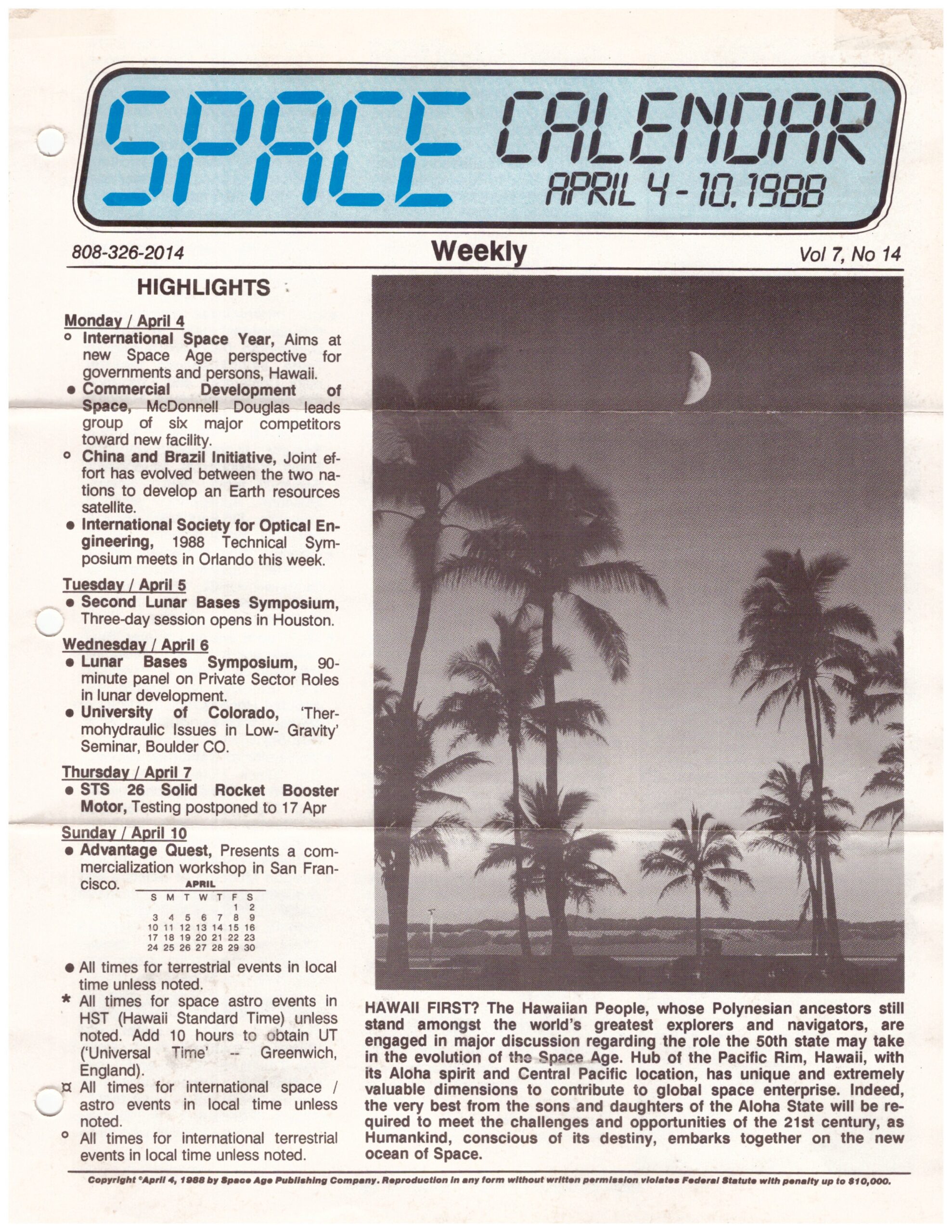 Space Calendar continues to serve the international space, lunar and astro industry and community as it has reliably since 1983 with its comprehensive Weekly calendar and Downrange, as well as editorial features covering industry events and space program advocacy.